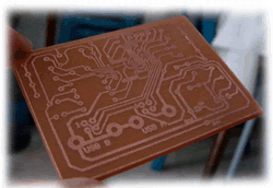 Etching Board PCB ke dalam plastik tupperware , bagian yang tidak terlapisi akan hilang, dan bagian yang terlapisi akan tinggal.